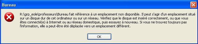 - A l'ouverture de session, message d'erreur "R:\grp_eole\professeurs\Bureau fait référence à un emplacement indisponible) (Cf fichier joint)