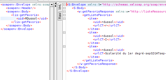 6) Regarder dans SOAPUI : cette fois si on relance la requête, cette fois 3 items sont retournés : le tout dernier que l'on vient de faire glisser, et deux favoris fantômes, dont l'urlCT est une lettre majuscule ou minuscule.