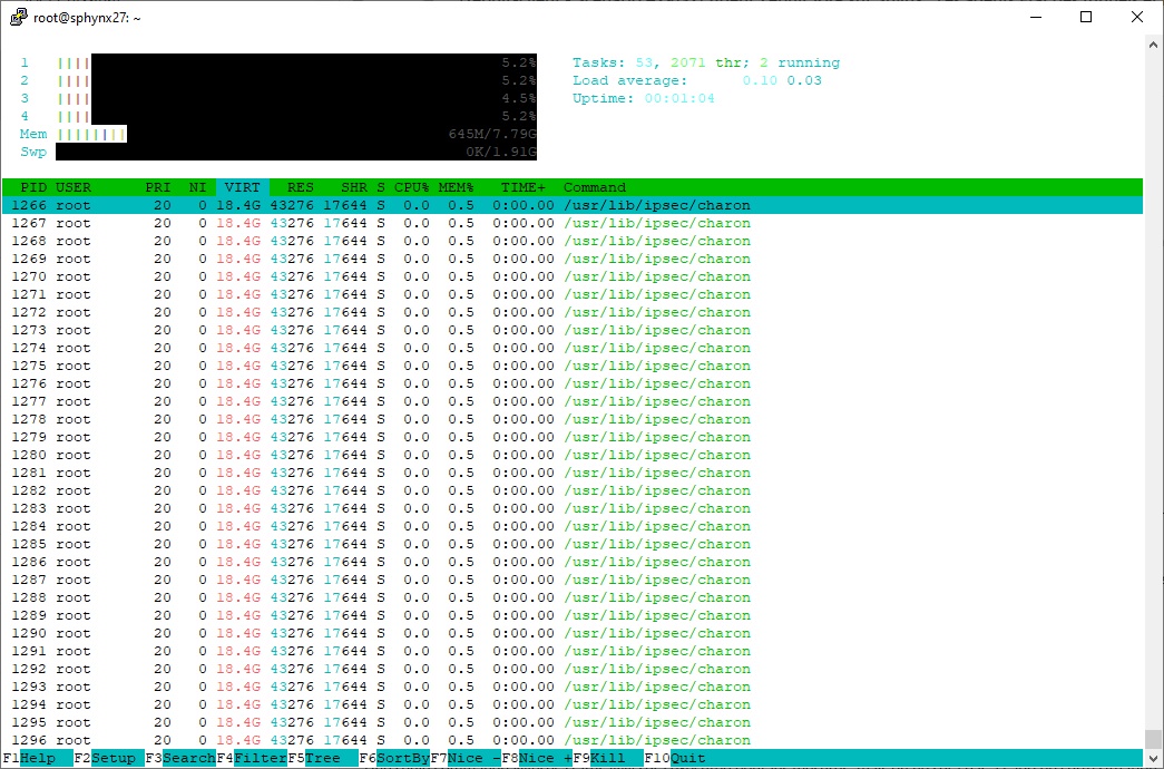 Je viens de relancer le service StrongSwan, sur les 6GO de RAM consommés je tombe à 5.3 GO.