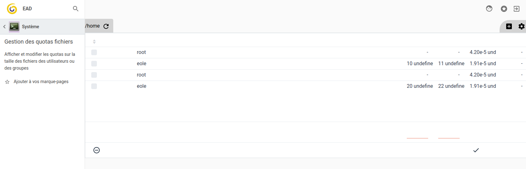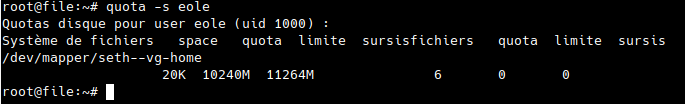 Et les noms d'utilisateurs semblent apparaître en double, et on peut placer des quotas différents sur le même user, et en ligne de commande seulement un quota est pris en compte (voir capture d'écran).