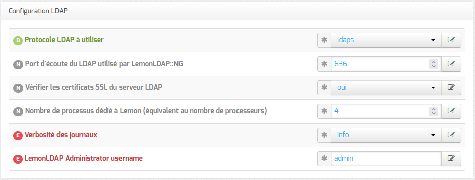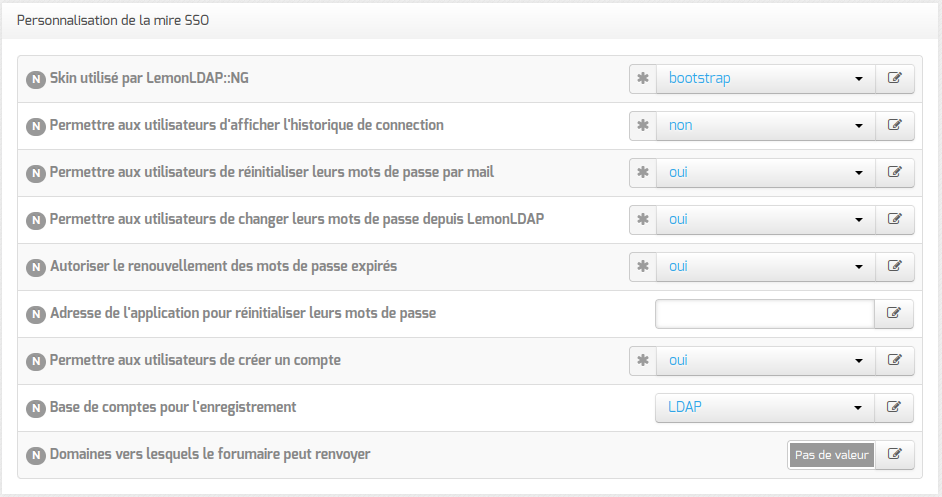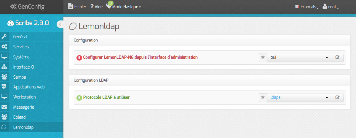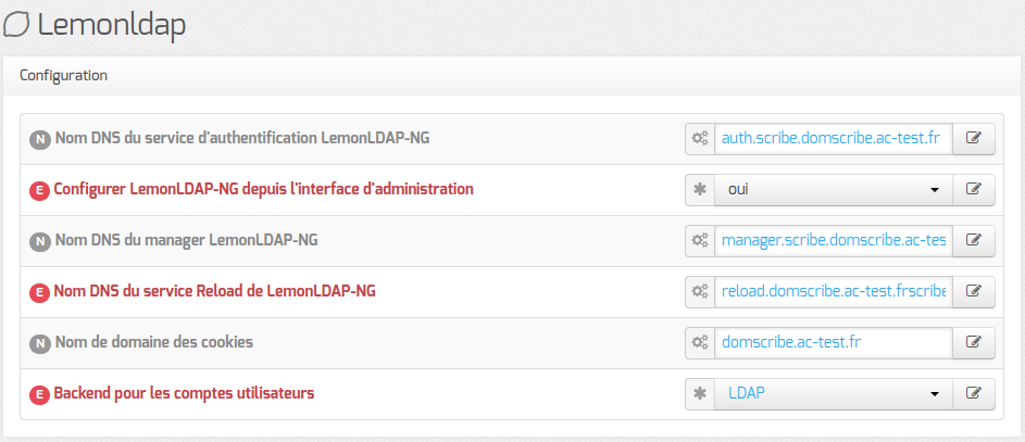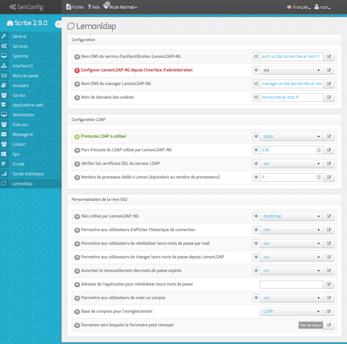 - Pour activer le serveur LemonLDAP::NG sur les modules Scribe, AmonEcole ou Seth Éducation, il faut installer le paquet eole-lemonldap-ng-auto. Le service sera alors pré-configuré pour utiliser l'annuaire du module.