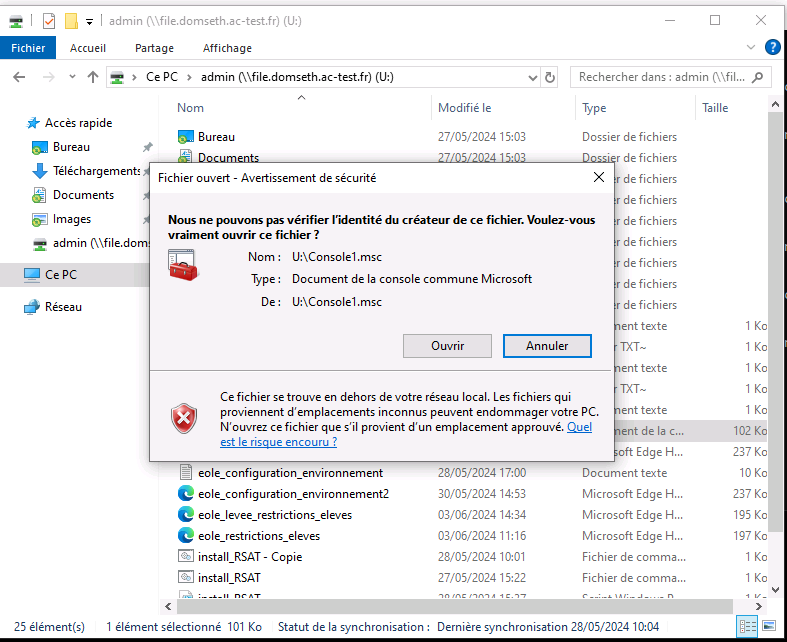 Sur Seth on a l'erreur "Nous ne pouvons pas vérifier l'identité du créateur de ce fichier. Voulez-vous vraiment ouvrir ce fichier ?" lorsque l'on clique sur un fichier qui se trouve dans U:.