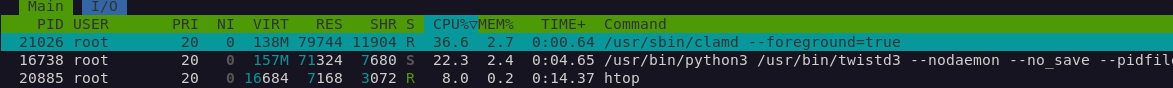Si on exécute htop sur une autre console, on s'aperçoit que clamd mange toutes les ressources