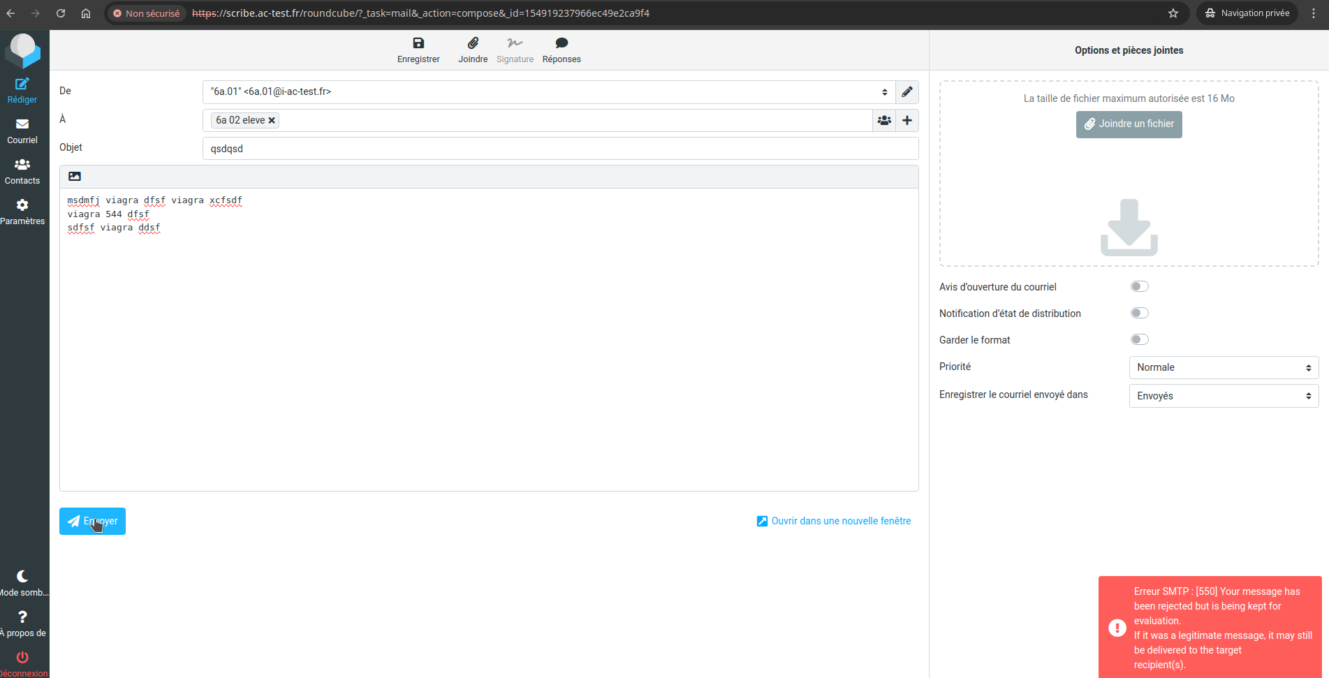 Si je met "viagra", "v1agra" ou "viaGra" dans le titre ou le body, le mail ne part pas sur roundcube (voir la capture).