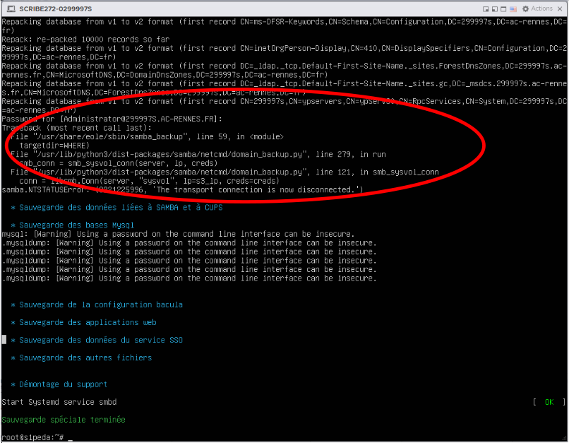 Capture 3 : Sauvegarde du contrôleur du domaine avec messages d'erreur