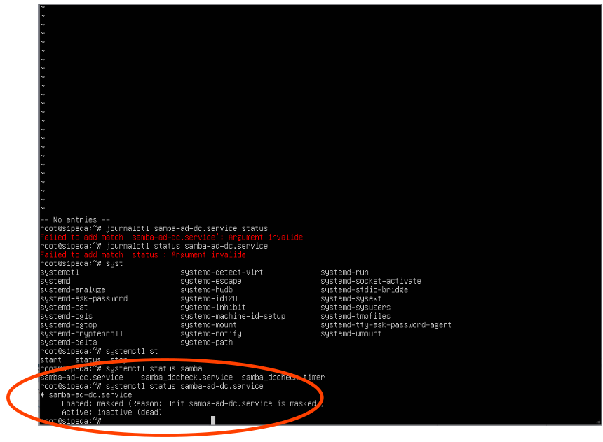 Lorsque je lance la commande: systemctl status samba-ad-dc.service il indique que le service est masqué et inactif (capture 2)