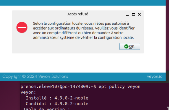 - En admin sur un PC10 avec Veyon 4.9.4 on voit le PC Linux (élève sur Ubuntu-24.04) mais on ne peut pas s'y connecter :